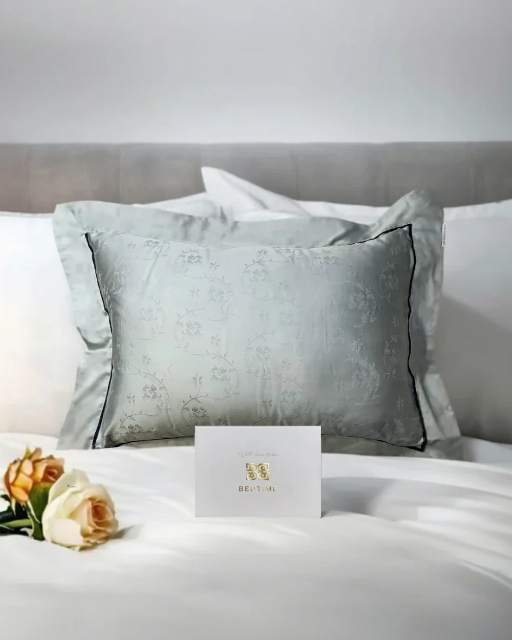 Et mykt damaskvevet eukalyptusputevar med delikat blomsterrankemønster i dus lys blå/grønn. Smal dekorasjonskant gir dette putetrekket et klassisk og elegant uttrykk. Eukalyptus er naturlig antibakterielt, noe som betyr at det motvirker bakterievekst og holder putetrekket friskt og rent lenger. Sengetøy i eukalyptus er også kjent for å være slitesterkt og krøller mindre enn bomull og lin.