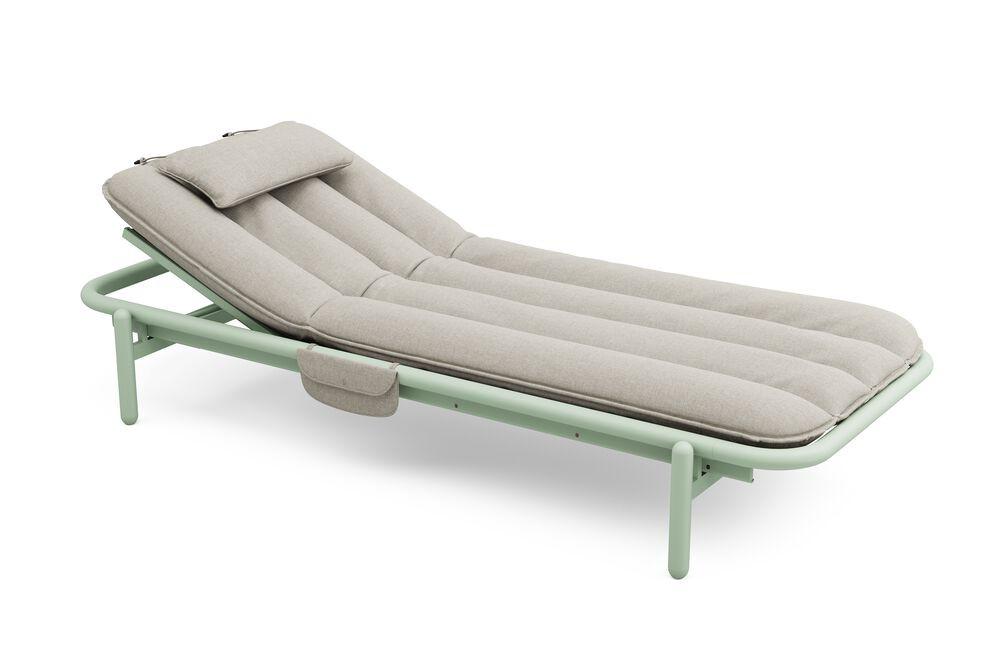 Sunbun er en generøs og ultrakomfortabel solseng der nostalgisk design møter moderne komfort. Formen refererer subtilt til de myke, avrundede formene til oppblåsbare design fra 70- og 80-tallet, gjenskapt med materialer av høy kvalitet og gjennomtenkte detaljer. Den robuste 85 cm brede aluminiumsrammen er UV- og værbestandig, enkel å montere og justerbar i fire posisjoner. Sunbun-puten er laget av olefinstoff med et pustende belegg, en nettingunderside som hjelper fuktighet med å slippe ut, og et komfortabelt skumfyll som holder formen vakkert. Praktiske stropper gjør det enkelt å plassere puten akkurat riktig. Du får også en matchende nakkestøtte og en liten oppbevaringspose. Enten du soler deg, leser eller bare slapper av, passer Sunbun uanstrengt inn i ethvert utendørsområde og inviterer deg til å slappe av i komfort.