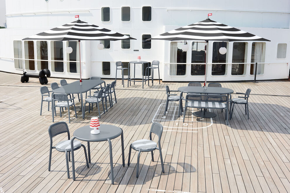 Den sjenerøse bordplaten og de vennlige, avrundede hjørnene på dette moderne utendørs spisebordet inviterer alle til å trekke opp en stol og bli med. Kombiner den med noen få Toní-stoler. Eller med Bankski, som har nøyaktig samme lengde som bordet. Ren tilfeldighet. Eller kanskje ikke.