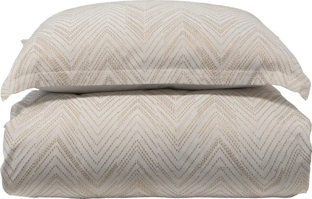 Zeva er et elegant sengesett i jaquardvevet sateng av fineste langfibrede bomull, TC 300. Det delikate sikksakkmønsteret i lys sand mot hvitt gir et tidløst og eksklusivt uttrykk. Mykt, svalt og komfortabelt – perfekt året rundt, og en sikker favoritt for den som verdsetter kvalitet.
