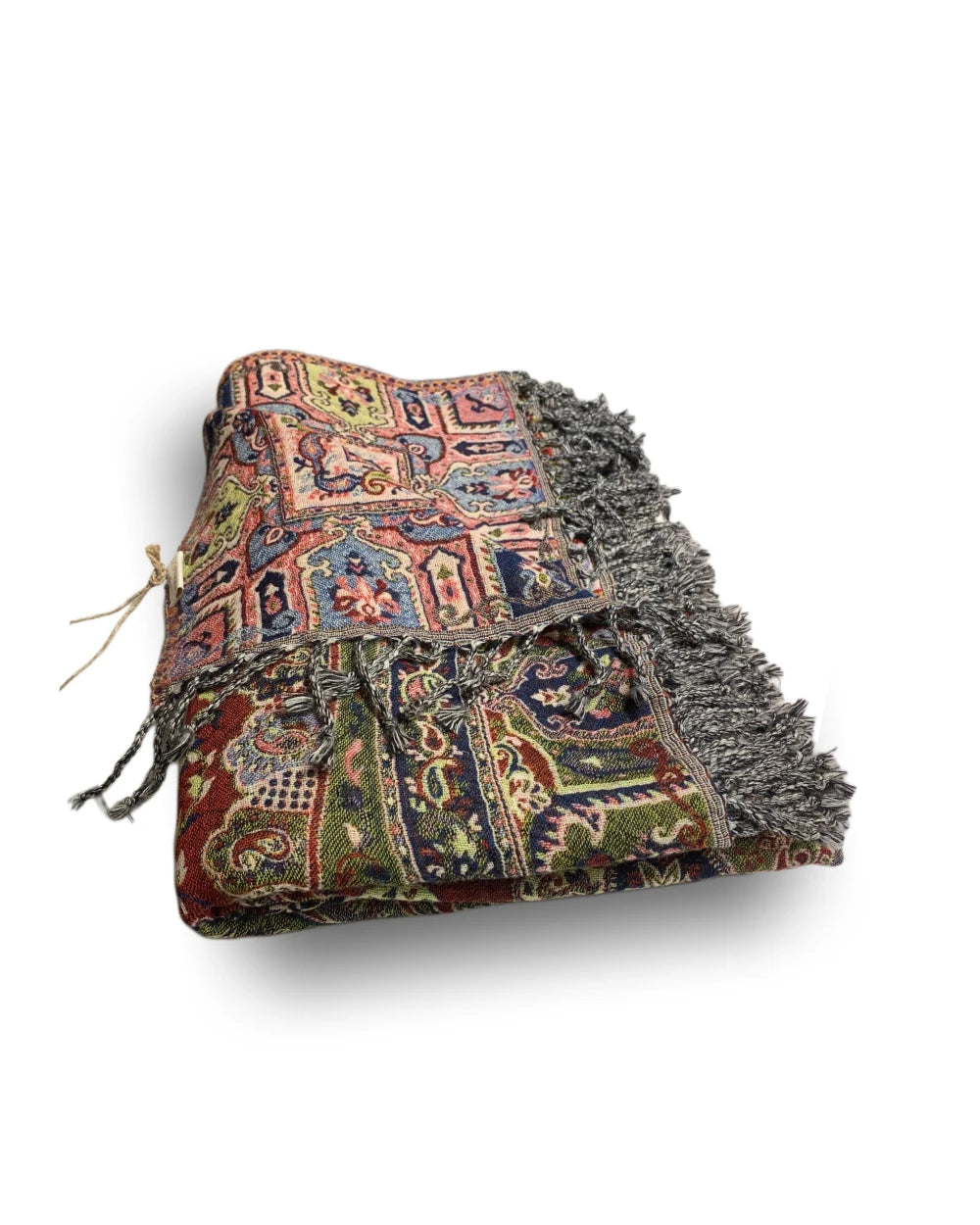 Teppet er 100% deilig og myk ull. Størrelse er 140×200 cm. Teppet må renses. Paisley mønster i nydelige duse farger. Ullpledd som gir en herlig myk følelse. Vevd paisley mønster.
